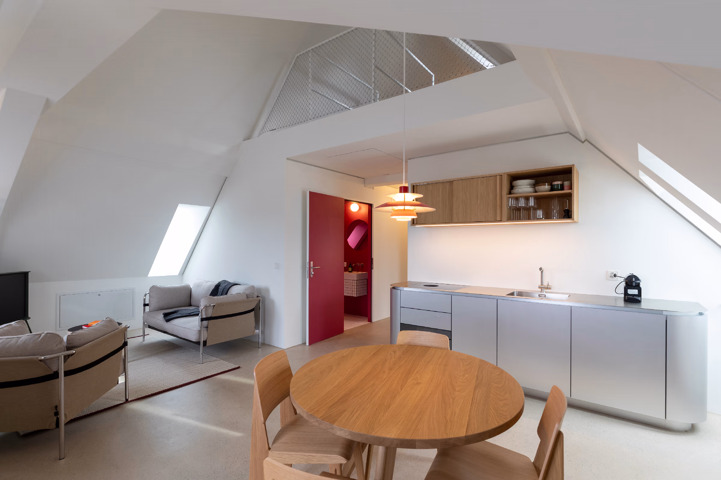 Möbliert mit Designklassikern und ausgestattet mit hochwertigen Leuchten und Textilien entsteht eine zeitgenössische und zugleich warme Atmosphäre im historischen Bestand.